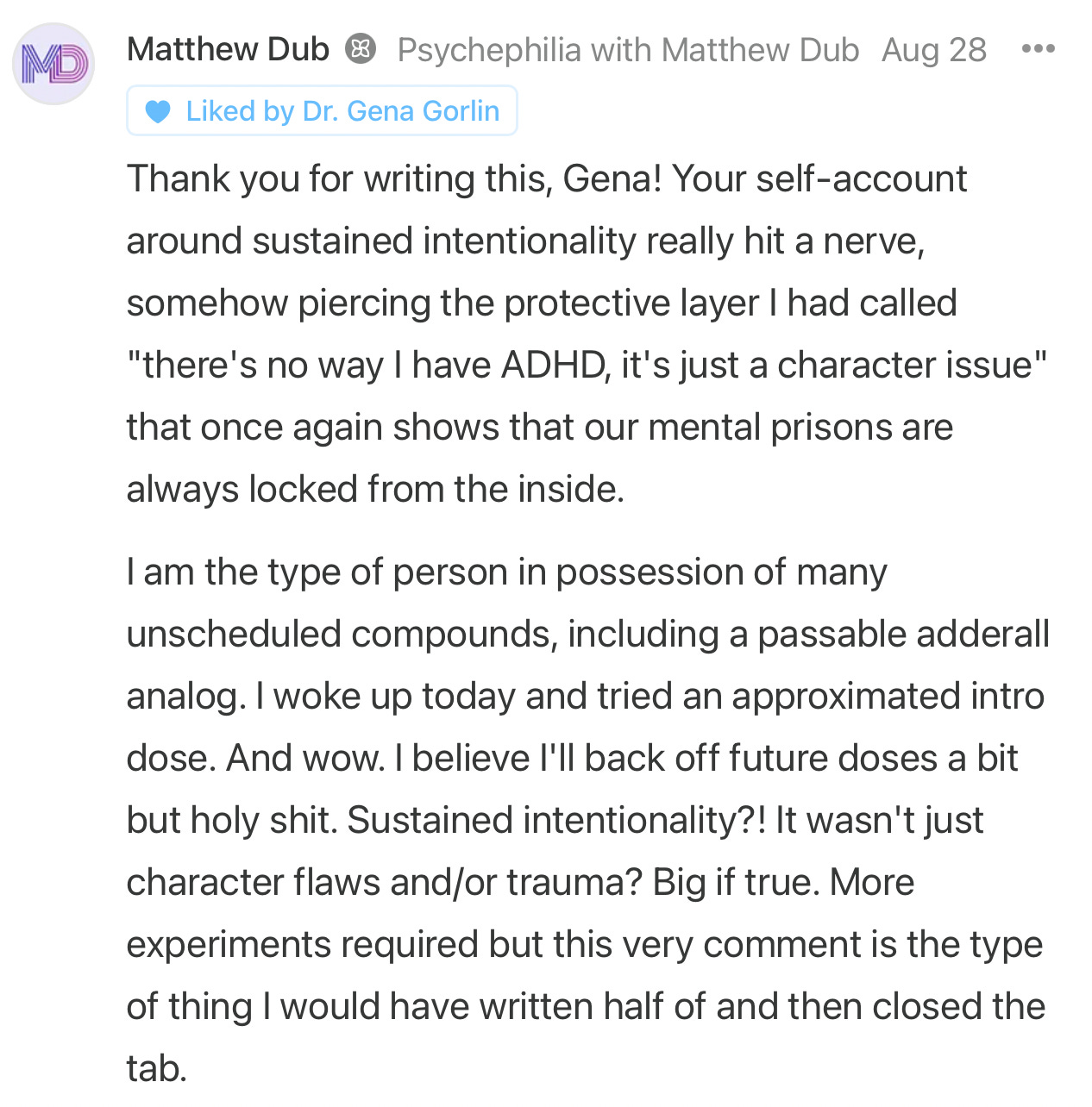 And then I read Gena Gorlin’s wonderful My journey from ADHD skeptic to Adderall enthusiast post: